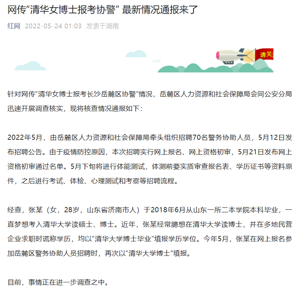 那么這位號(hào)稱清華女博士的張某,究竟是何許人也?5月24日凌晨,據(jù)紅網(wǎng)報(bào)道,湖南省長(zhǎng)沙市岳麓區(qū)人力資源和社會(huì)保障局會(huì)同公安分局通報(bào)稱,經(jīng)調(diào)查,張某(女,28歲,山東省濟(jì)南市人)實(shí)為二本學(xué)院本科畢業(yè),近年張某經(jīng)常臆想在清華大學(xué)讀博士,并在多地民營(yíng)企業(yè)求職時(shí)謊稱學(xué)歷,均以“清華大學(xué)博士畢業(yè)”填報(bào)學(xué)歷學(xué)位。今年5月,張某在網(wǎng)上報(bào)名參加岳麓區(qū)警務(wù)協(xié)助人員招聘時(shí),再次以“清華大學(xué)博士”填報(bào)。