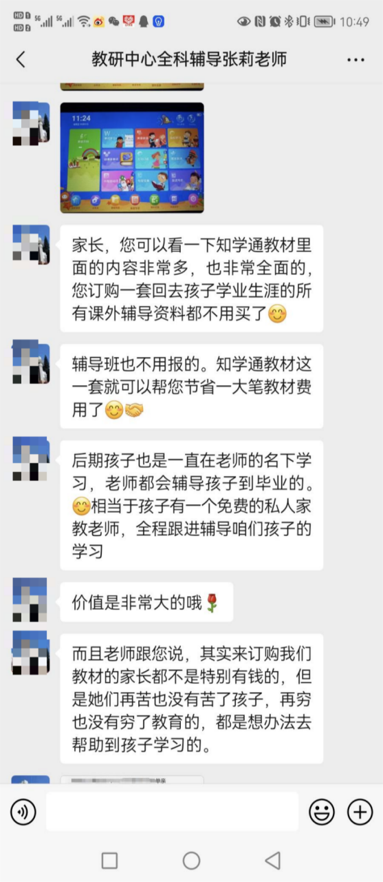 然而,張女士在打開(kāi)U盤(pán)后卻發(fā)現(xiàn),里面的內(nèi)容多是一些常規(guī)練習(xí)題。在張女士對(duì)此表達(dá)出并不滿(mǎn)意后,對(duì)方緊接著介紹了一款“知學(xué)通”平板學(xué)習(xí)機(jī),表示這款學(xué)習(xí)機(jī)更適合張女士的孩子,不僅囊括了從小學(xué)到高中的全科課程,還有老師一對(duì)一教學(xué)。考慮到張女士剛購(gòu)買(mǎi)了U盤(pán),只需要補(bǔ)齊產(chǎn)品的差價(jià)即可獲得。張女士看到機(jī)構(gòu)培訓(xùn)老師專(zhuān)業(yè)詳細(xì)的介紹和及時(shí)的反饋,便又給對(duì)方賬戶(hù)轉(zhuǎn)入一萬(wàn)余元,升級(jí)成了知學(xué)通平板用戶(hù)。