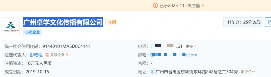 莫女士則通過(guò)查詢(xún)寄送學(xué)習(xí)機(jī)的快遞,獲取了“廣州教研中心”的地址和電話(huà)。信息顯示,這是一個(gè)名為“廣州卓學(xué)文化傳播有限公司”的小微企業(yè),但是于2023年11月已經(jīng)注銷(xiāo)。