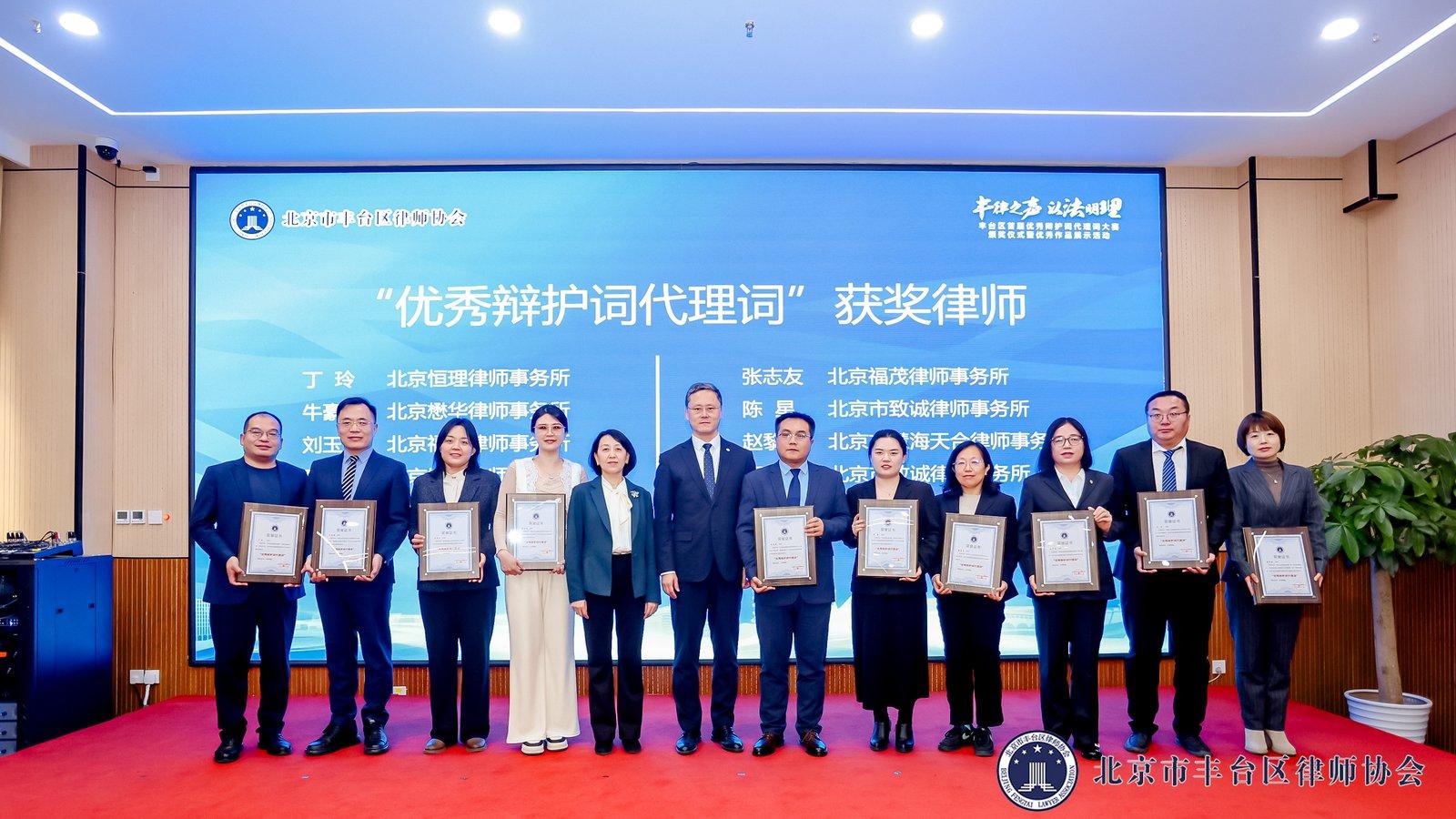12月3日,由北京市豐臺(tái)區(qū)司法局指導(dǎo),豐臺(tái)區(qū)律師協(xié)會(huì)主辦的首屆優(yōu)秀辯護(hù)詞代理詞大賽頒獎(jiǎng)儀式暨優(yōu)秀作品展示活動(dòng)圓滿收官。北京市律師協(xié)會(huì)副會(huì)長(zhǎng)郝春莉,豐臺(tái)區(qū)委政法委副書記王文征,豐臺(tái)區(qū)司法局黨組成員、副局長(zhǎng)佟穎,北京市律師協(xié)會(huì)副會(huì)長(zhǎng)、豐臺(tái)區(qū)律師協(xié)會(huì)會(huì)長(zhǎng)胡占全等領(lǐng)導(dǎo)及行業(yè)知名專家出席活動(dòng),豐臺(tái)區(qū)律師協(xié)會(huì)品牌建設(shè)委員會(huì)主任時(shí)福茂主持大會(huì)。