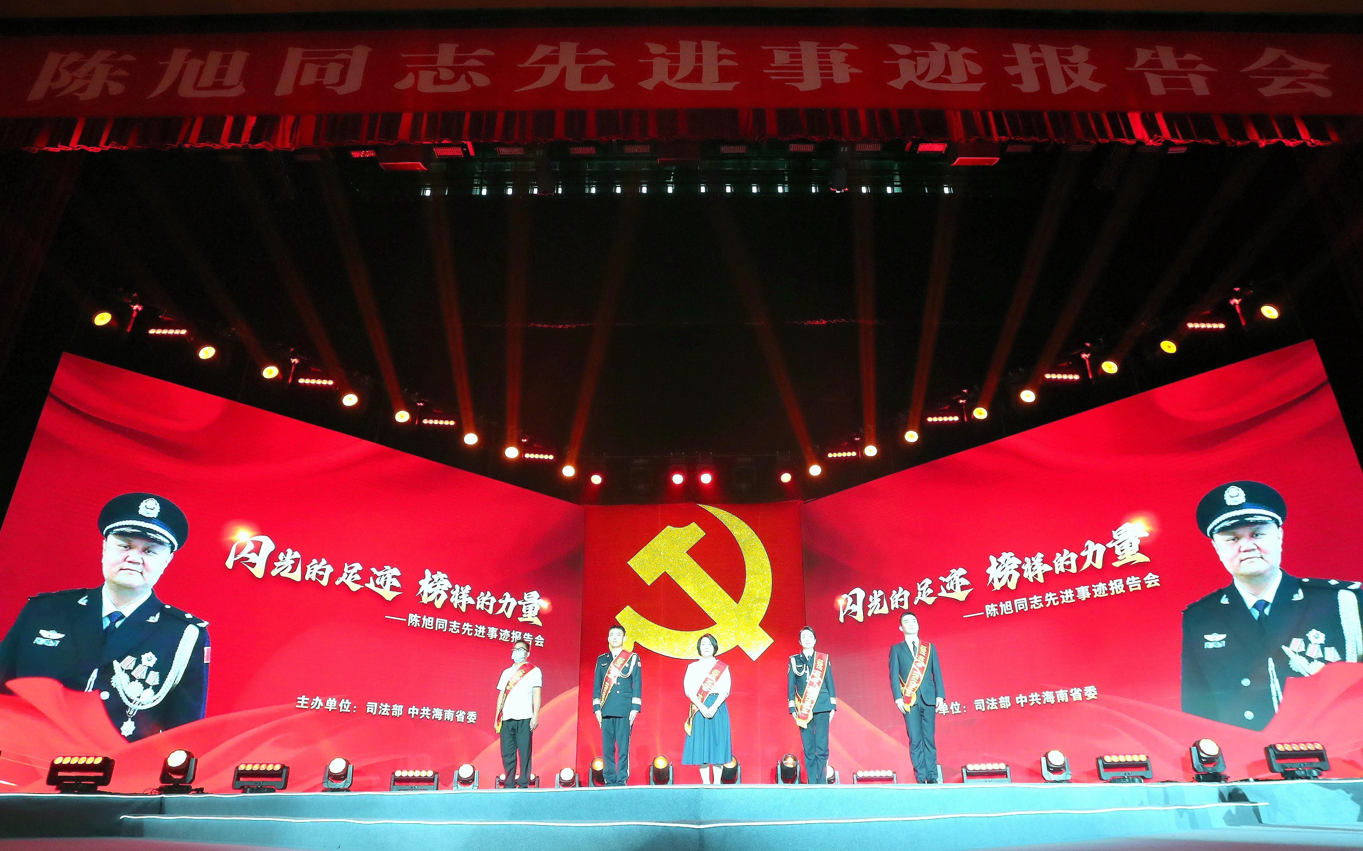 陳旭生前系海南省府城強制隔離戒毒所黨委書記、所長、一級高級警長。2022年5月22日,陳旭在海南省司法廳警銜晉升培訓班授課時突發(fā)腦溢血,經(jīng)搶救無效不幸離世,年僅50歲。2022年10月1日,海南省委追授陳旭同志“海南省優(yōu)秀共產(chǎn)黨員”稱號,海南省委、省政府為其追記個人一等功。2023年3月30日,人力資源和社會保障部、司法部追授其為“全國司法行政系統(tǒng)一級英雄模范”稱號。報告會上,由陳旭妻子、同事、受助人員和新聞媒體記者共5人組成先進事跡報告團,講述了陳旭29年如一日扎根司法行政基層一線的感人事跡。