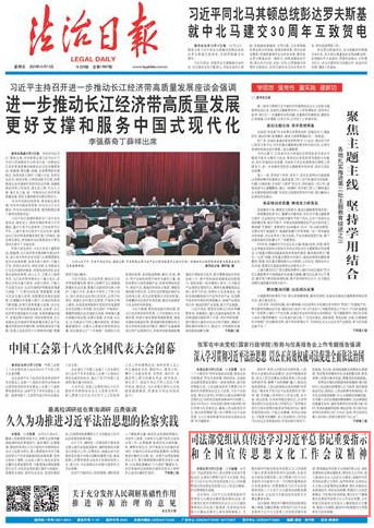 會議強調(diào),要堅持不懈用黨的創(chuàng)新理論凝心鑄魂,在融會貫通、學悟篤行習近平法治思想和習近平文化思想上采取更多硬實舉措。要加強宣傳思想文化領域行政立法,加快完善相關法律法規(guī)體系。要堅定文化自信,深入推進社會主義法治文化建設,加強中華優(yōu)秀傳統(tǒng)法律文化保護、宣傳和傳承,弘揚社會主義核心價值觀和法治精神。要扎實做好法治新聞宣傳,講好法治故事,鞏固壯大主流思想輿論,守好意識形態(tài)陣地。要以釘釘子精神落實全國宣傳思想文化工作會議部署,立足職能為在新的歷史起點上繼續(xù)推動文化繁榮、建設文化強國、建設中華民族現(xiàn)代文明提供有力法治保障。