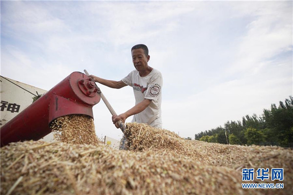 6月13日,雄安新區(qū)大王鎮(zhèn)小王村村民李有忠在收獲小麥。 近日,雄安新區(qū)小麥陸續(xù)成熟,當(dāng)?shù)卮迕駬屪マr(nóng)時進(jìn)行收獲。 新華社記者 邢廣利 攝
