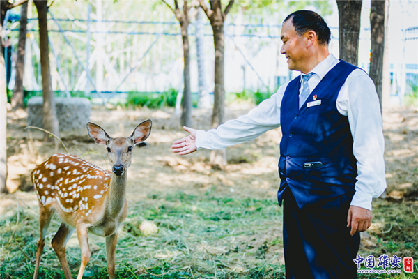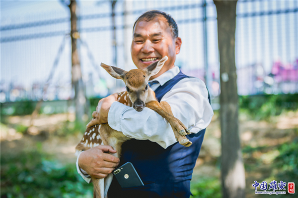 6月23日下午1點48分,雄安新區(qū)的梅花鹿“雄雄、安安”順利生下鹿寶寶。圖為雄安市民服務(wù)中心園區(qū)環(huán)境管理部主任李國元抱著鹿寶寶。中國雄安官網(wǎng)記者馬夢迪 攝