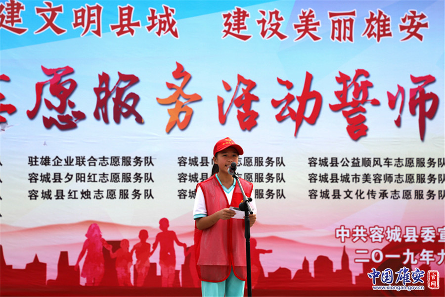 會(huì)上首先舉行了授旗儀式。容城縣委宣傳部長(zhǎng)李鶴賓依次為14支志愿服務(wù)隊(duì)授旗。其中,來(lái)自“陽(yáng)光醫(yī)療志愿服務(wù)隊(duì)”的志愿者代表王靜宣和青年學(xué)生代表石佳桐輪流作表態(tài)發(fā)言。最后,全體志愿者進(jìn)行了志愿服務(wù)宣誓。