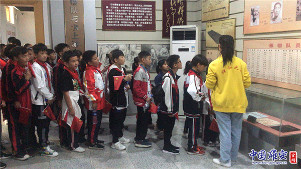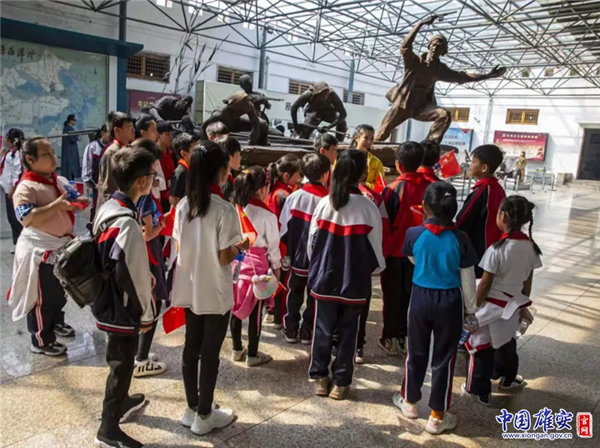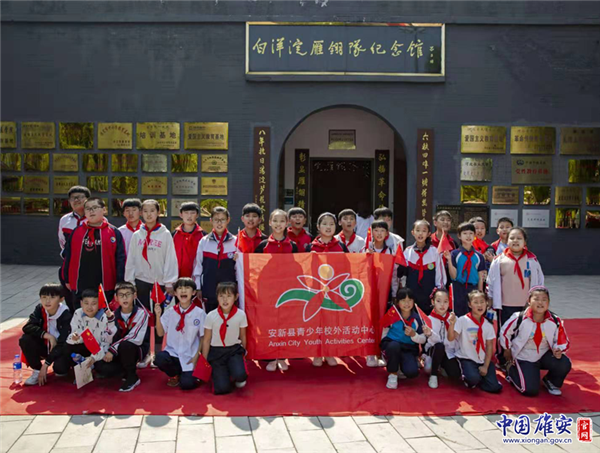 孩子們?cè)诎籽蟮硌泗彡?duì)紀(jì)念館門口合影留念。中國(guó)雄安官網(wǎng)發(fā)