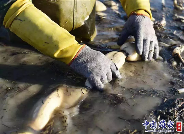 用雙手將藏在水下的蓮藕一一挖出