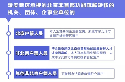 答:除雄安新區(qū)承接的北京籍轉(zhuǎn)移人口、引進的人才、原籍雄安新區(qū)的大中專院校學(xué)生、直系親屬投靠且按相關(guān)規(guī)定可在雄安新區(qū)直接辦理落戶的人員外,在雄安新區(qū)合法穩(wěn)定就業(yè)并居住的非雄安新區(qū)戶籍人員,符合本辦法規(guī)定條件申請積分落戶的,適用本辦法。