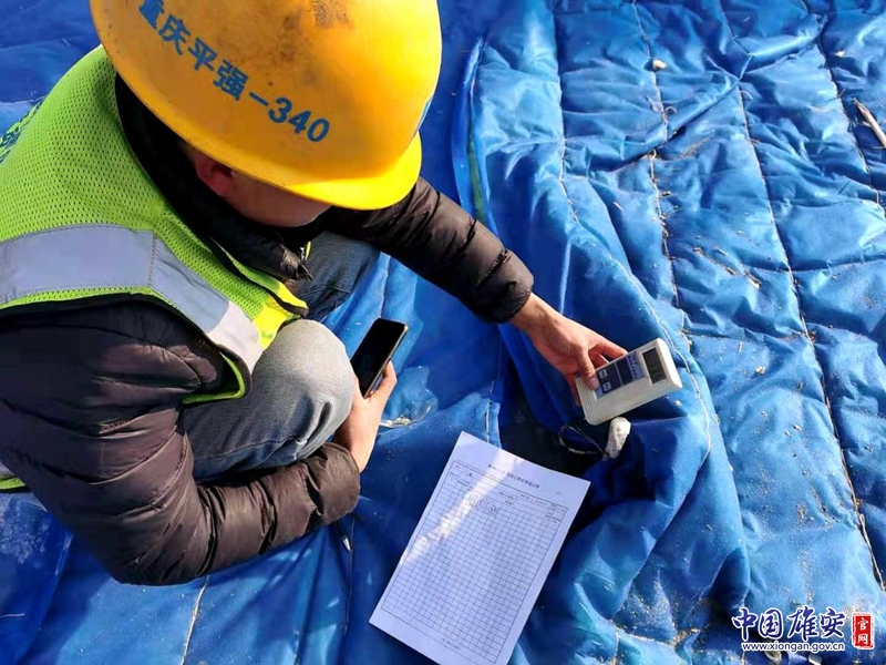 雄安商務(wù)服務(wù)中心項(xiàng)目二標(biāo)段建設(shè)現(xiàn)場(chǎng),建設(shè)工人對(duì)施工作業(yè)面進(jìn)行測(cè)溫。中建八局供圖