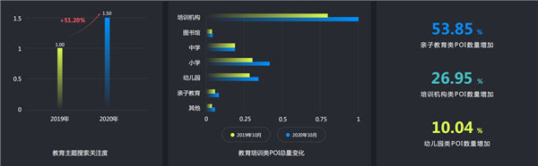 2020年雄安新區(qū)服務(wù)業(yè)相關(guān)需求出現(xiàn)了較大的增長(zhǎng)。其中,維修、物流等相關(guān)搜索詞的用戶搜索量分別增長(zhǎng)了78.74%和18.09%,而這兩類POI的數(shù)量相較于2019年同期也分別增長(zhǎng)了28.49%和7.8%;親子教育類POI、培訓(xùn)機(jī)構(gòu)類POI和幼兒園POI增量分別為53.85%、26.95%和10.04%;醫(yī)療和汽車服務(wù)類POI數(shù)量的增長(zhǎng)比例均達(dá)到30%;美食類POI數(shù)量同比增長(zhǎng)24.7%,;購(gòu)物類POI數(shù)量同比增長(zhǎng)13.7%;