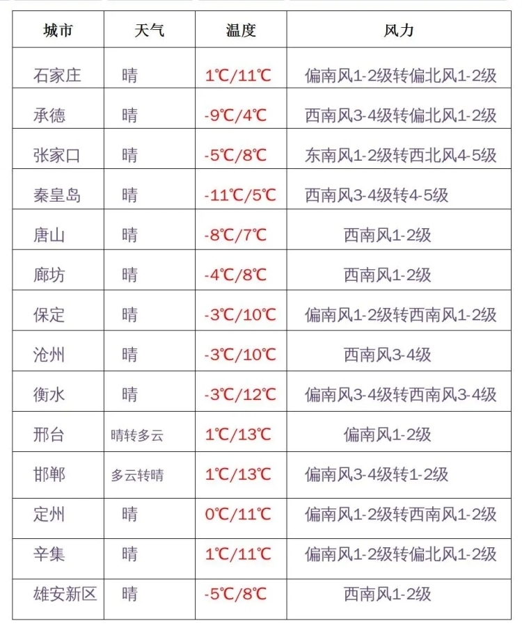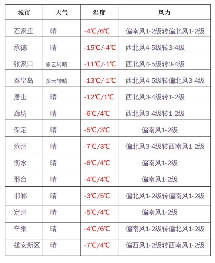 今天早晨,各地最低氣溫全部在-5℃以下,而北部地區(qū)以及滄州,還會跌破-10℃線。