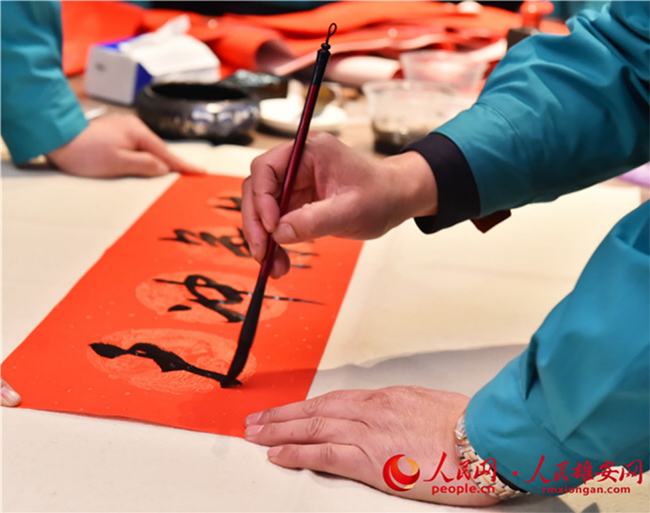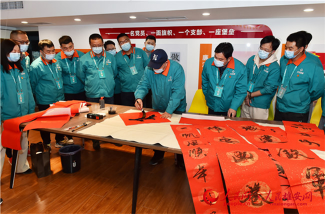 雄安新區(qū)容東片區(qū)B1組團(tuán)安置房項(xiàng)目留在雄安過(guò)年建設(shè)者寫春聯(lián)。