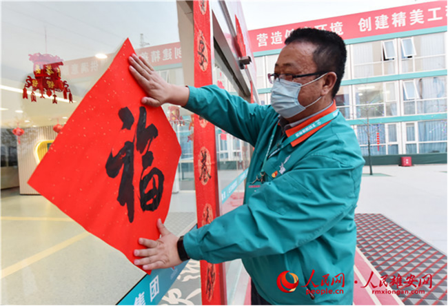 雄安新區(qū)容東片區(qū)B1組團(tuán)安置房項(xiàng)目留雄過(guò)年建設(shè)者貼福字。