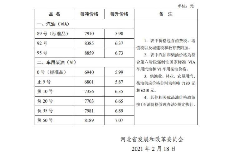 2月18日,河北省發(fā)展和改革委員會發(fā)布《關于調整我省成品油價格的公告》。根據(jù)現(xiàn)行成品油價格形成機制,自2021年2月18日24時起,河北省汽、柴油價格(標準品)每噸分別提高275元、265元,調整后的汽、柴油最高零售價格見下表。乙醇汽油價格按同標號汽油(VIA)價格執(zhí)行,普通柴油價格按照同標號車用柴油(VI)價格執(zhí)行,98號汽油價格由成品油生產(chǎn)經(jīng)營企業(yè)根據(jù)市場情況自主制定具體價格。(河北日報記者潘文靜)