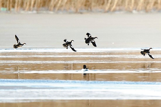 在園博園園博湖附近,鳥兒迎著日出展翅飛翔。隨著永定河生態(tài)環(huán)境越來越好,已有十幾種野生鳥類活躍在周邊。 北京日報記者 劉平攝