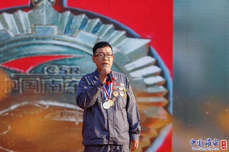 來(lái)自中車(chē)石家莊車(chē)輛有限公司的馬龍飛向觀眾講述了《大國(guó)工匠是這樣煉成的》的故事。中國(guó)雄安官網(wǎng)記者毛鶴然 攝