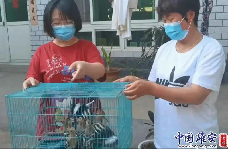 陳思岐(左一)與受助的7只戴勝雛鳥(niǎo)。安新縣自然資源局供圖