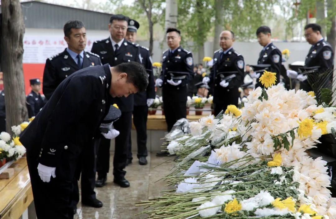 四位特警邁著莊重的步伐,向烈士紀(jì)念碑敬獻(xiàn)花籃,鄭永豐、鄔亮上前整理挽聯(lián),為先烈擦拭紀(jì)念碑,并將手中花束置于紀(jì)念碑前。隨著哀樂響起,全體人員脫帽肅立,向革命烈士默哀以寄托無(wú)限哀思。