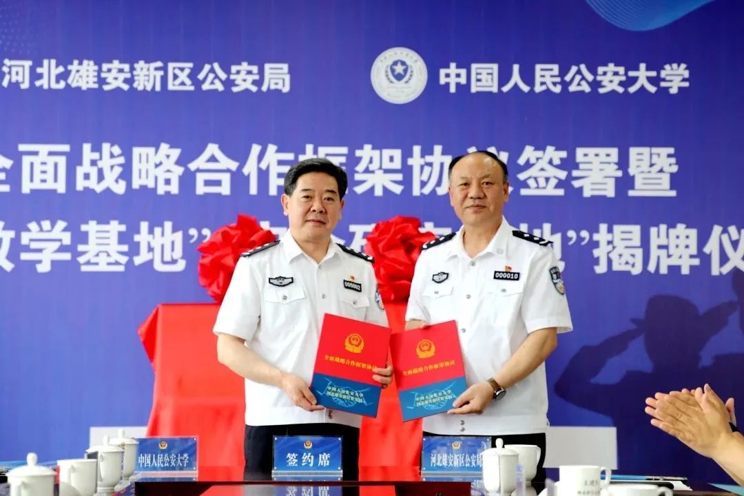 河北省公安廳黨委委員、新區(qū)公安局黨委書記、局長(zhǎng)姚愛(ài)國(guó),公安大學(xué)黨委副書記、校長(zhǎng)曹詩(shī)權(quán)出席儀式,共同簽署協(xié)議并揭牌。
