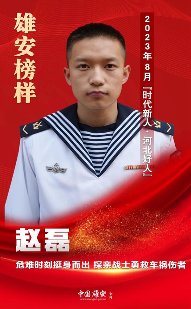 據(jù)了解,趙磊出生于2000年,2020年9月在大學期間應征入伍,現(xiàn)在是海軍某部的一名潛水員。趙磊在部隊多次參加重大活動受到表彰,榮立集體三等功一次。他在干好本職工作的同時,還熱心參與社會公益事業(yè),今年7月被聘為“雄縣2023年征兵宣傳形象大使”和“雄縣職教中心校外思政輔導員”,還被河北省文明委評為“‘雙爭’有我——2023年8月‘時代新人·河北好人’”。