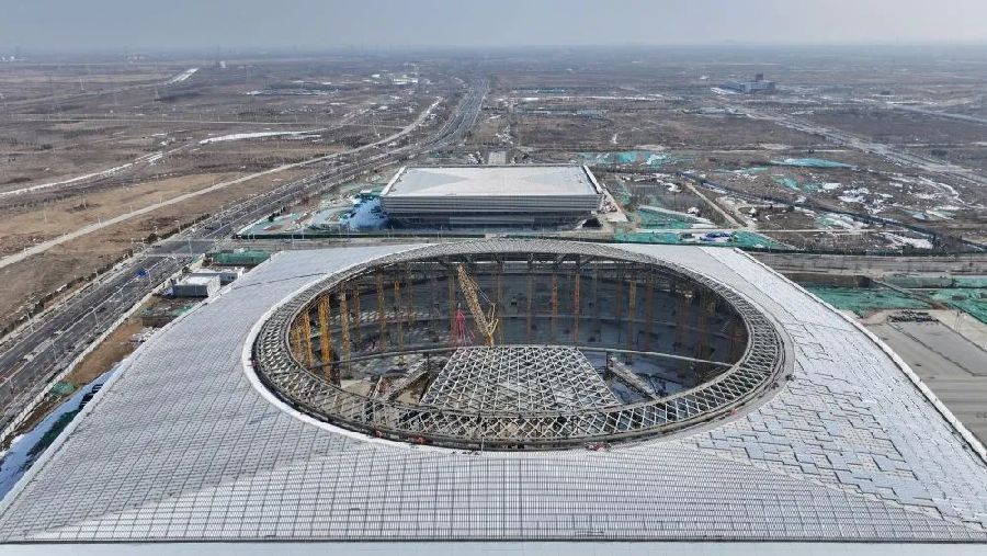 雄安體育中心建設(shè)現(xiàn)場(chǎng)(2月7日攝,無(wú)人機(jī)照片)。新華社記者牟宇 攝