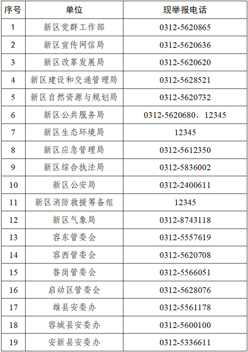 為認(rèn)真貫徹落實(shí)《中華人民共和國(guó)安全生產(chǎn)法》《河北省安全生產(chǎn)條例》和《河北省安全生產(chǎn)舉報(bào)和獎(jiǎng)勵(lì)辦法(試行)》等法律法規(guī)和文件規(guī)定,鼓勵(lì)企業(yè)內(nèi)部員工和廣大群眾舉報(bào)安全生產(chǎn)事故隱患和非法違法行為,進(jìn)一步加強(qiáng)安全生產(chǎn)領(lǐng)域社會(huì)監(jiān)督,及時(shí)治理和消除各類安全隱患,現(xiàn)將雄安新區(qū)各單位的安全生產(chǎn)舉報(bào)電話公示如下: