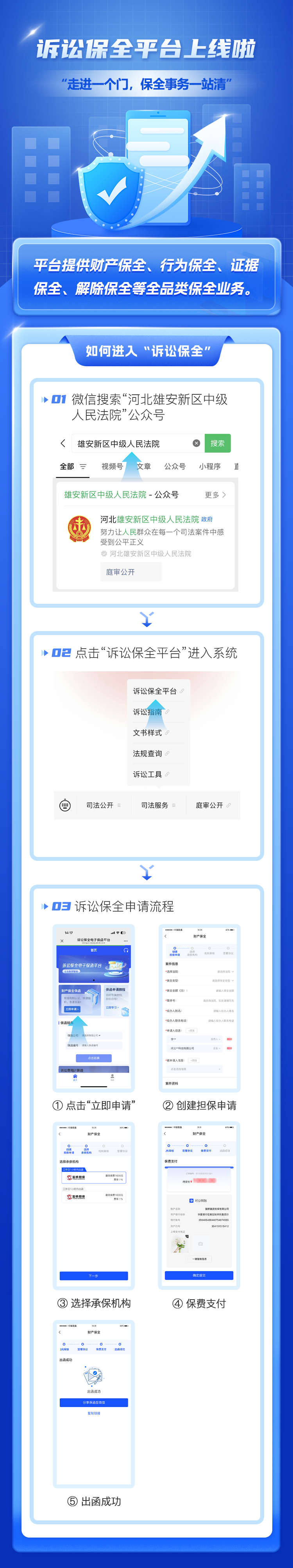 為深入推動法院工作與現(xiàn)代科技深度融合,雄安法院聚焦提升訴訟保全信息化、智慧化水平,上線“訴訟保全電子保函服務(wù)平臺”,實現(xiàn)電子保函業(yè)務(wù)從申請、開具、傳輸、管理到驗證環(huán)節(jié)的“全程網(wǎng)辦”,做到“走進一個門,保全事務(wù)一站清”,優(yōu)化了保全流程,提高了服務(wù)效率。