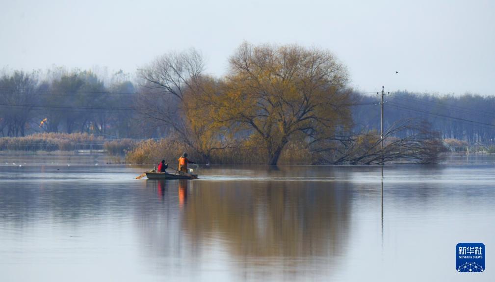 初冬時(shí)節(jié),淀邊村民行舟于白洋淀。新華社發(fā)(周龍山 攝)
