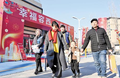 1月17日,雄安新區(qū)容西片區(qū)馨水社區(qū)北回遷安置房交付點(diǎn),回遷居民李金梅(左二)與家人和驗(yàn)房師一起前往新居驗(yàn)房收房。記者劉光昱攝