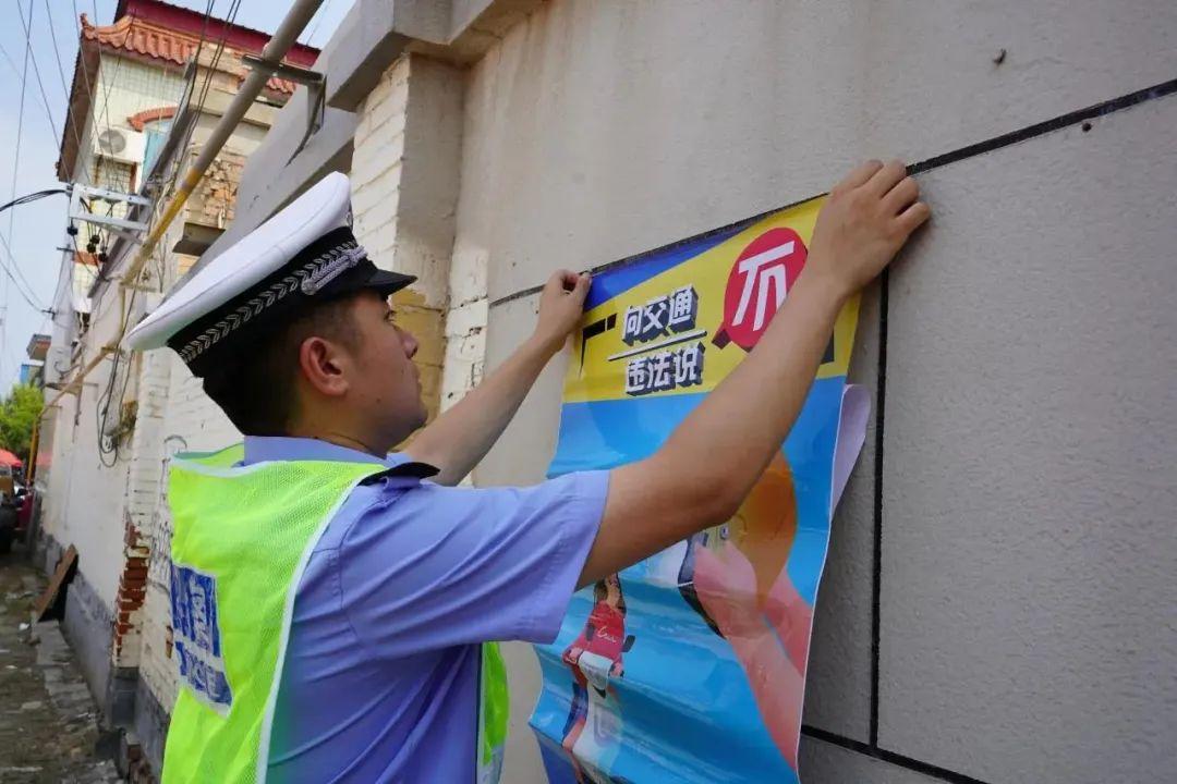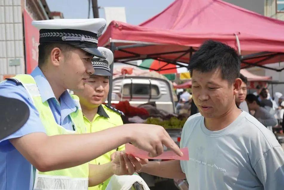 集市墻面、攤位旁,民警認真張貼交通安全海報,“向交通違法說不”等標語醒目亮眼。把交通安全知識“貼”進生活場景,讓往來群眾隨時能看到,潛移默化提升安全意識。