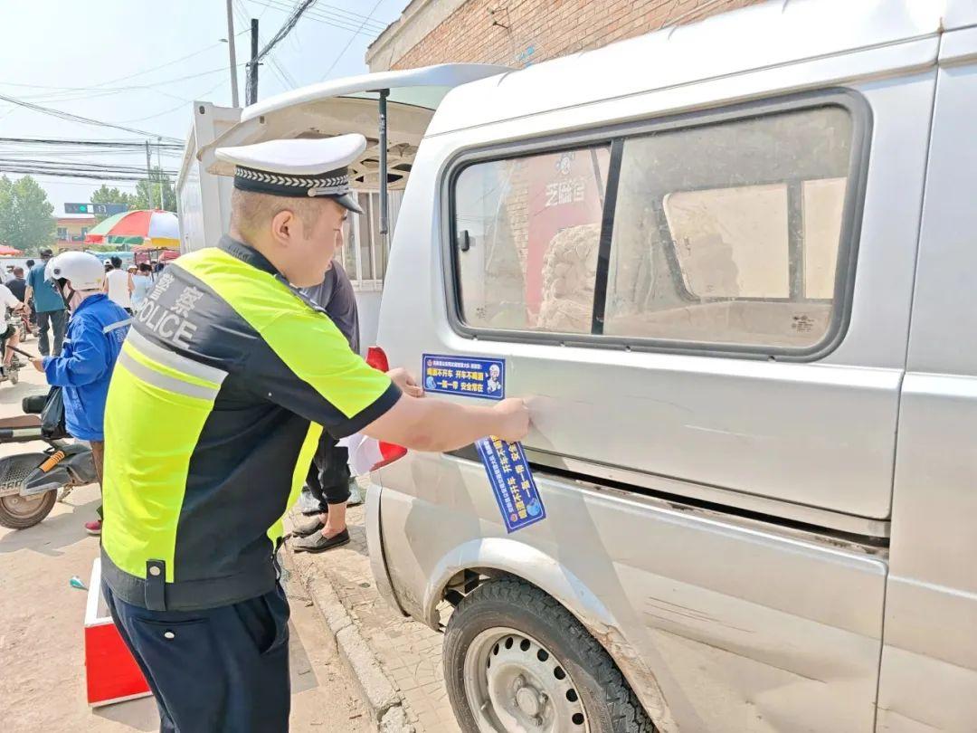 穿梭在集市車流中,民警為來往車輛貼上醒目標語:“喝酒不開車,開車不喝酒;一盔一帶,安全常在”。