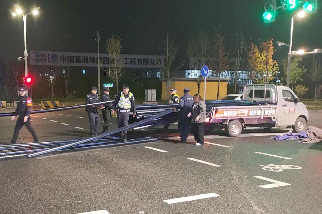 吉海祥帶領(lǐng)執(zhí)勤隊(duì)員迅速行動(dòng),一組在來車方向擺放警示標(biāo)識(shí),引導(dǎo)車輛緩慢繞行;一組幫助搬抬金屬管材,合力將其逐一裝回車上。經(jīng)過近20分鐘的緊張忙碌,所有散落管材均被重新裝載上車。