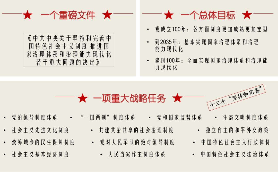 10月28日至10月31日,中國(guó)共產(chǎn)黨第十九屆中央委員會(huì)第四次全體會(huì)議在北京召開。會(huì)議審議通過了《中共中央關(guān)于堅(jiān)持和完善中國(guó)特色社會(huì)主義制度、推進(jìn)國(guó)家治理體系和治理能力現(xiàn)代化若干重大問題的決定》(以下簡(jiǎn)稱《決定》)。10月31日,四中全會(huì)《公報(bào)》發(fā)布;11月5日,《決定》全文發(fā)布。