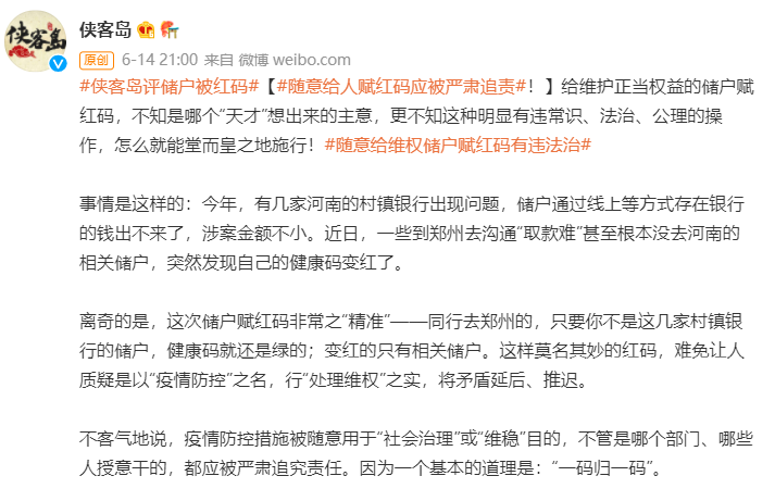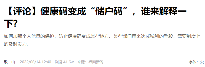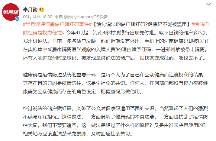 目前,不少網(wǎng)民猜測(cè)河南利用健康碼阻止儲(chǔ)戶維權(quán),并對(duì)健康碼能被用于防疫之外感到擔(dān)憂。值得注意的是,早在2021年1月,國務(wù)院聯(lián)防聯(lián)控機(jī)制綜合組印發(fā)《新冠肺炎疫情防控健康碼管理與服務(wù)暫行辦法》,強(qiáng)調(diào)各地要嚴(yán)格健康碼功能定位,不得擴(kuò)大應(yīng)用范圍,切實(shí)防止“碼上加碼”。河南給儲(chǔ)戶賦“紅碼”被輿論廣泛質(zhì)疑違反上述規(guī)定,相關(guān)輿情仍在持續(xù)發(fā)酵。截至6月17日12時(shí),相關(guān)微博話題閱讀量累計(jì)超21億。