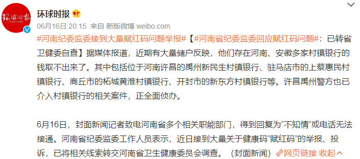 編者按:6月13日,網(wǎng)絡(luò)流傳信息顯示,多名前往鄭州溝通村鎮(zhèn)銀行“取款難”的儲(chǔ)戶被賦“紅碼”。6月16日,有媒體致電河南省行政審批和政務(wù)信息管理局、省疫情防控指揮部等多個(gè)相關(guān)職能部門,得到回復(fù)為“不知情”或電話無法接通。河南省紀(jì)委監(jiān)委工作人員表示,近日接到大量關(guān)于健康碼“賦紅碼”的舉報(bào)和投訴,已將相關(guān)線索轉(zhuǎn)交省衛(wèi)生健康委員會(huì)調(diào)查。