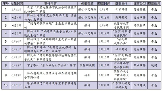 6月網(wǎng)絡(luò)涉法謠言辟謠榜單共梳理、匯總10起熱點(diǎn)事件,圍繞謠言持續(xù)時(shí)間、傳播渠道、產(chǎn)生地域、類型以及辟謠平臺(tái)等維度綜合分析,篩選兩起關(guān)注度較高、具有典型意義的案例研判,以期為網(wǎng)絡(luò)辟謠工作提供參考借鑒。