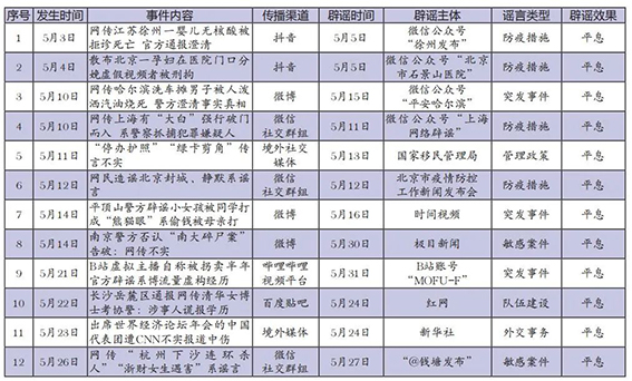 從謠言內(nèi)容來(lái)看,5月涉疫謠言仍占多數(shù),但熱度及影響力有所降低,表明網(wǎng)民對(duì)謠言的甄別能力顯著提高。值得注意的是,部分涉疫謠言因情節(jié)離奇且具有較強(qiáng)的情緒煽動(dòng)力,曝出后快速發(fā)酵,如網(wǎng)傳“北京一孕婦在醫(yī)院門口分娩”等謠言。當(dāng)?shù)赜嘘P(guān)部門辟謠及時(shí),有效消除誤會(huì)。本月,部分網(wǎng)民針對(duì)惡性案件、舊案積案造謠,通過(guò)渲染案情、捏造案件調(diào)查進(jìn)展獲得關(guān)注,如編造“杭州下沙連環(huán)殺人”“浙財(cái)女生遇害”“‘南大碎尸案’告破”等謠言。所屬地公安機(jī)關(guān)主動(dòng)澄清謠言,但部分輿論對(duì)舊案關(guān)注熱度仍有增無(wú)減,輿情多呈現(xiàn)“長(zhǎng)尾效應(yīng)”。本月境外媒體惡意造謠、抹黑我國(guó)現(xiàn)象較為凸顯,如敵媒編造“停辦護(hù)照”“綠卡剪角”傳言攻擊我國(guó)出入境管理措施等。對(duì)此,有關(guān)部門嚴(yán)正發(fā)聲,有力回?fù)舨粚?shí)報(bào)道。