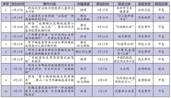 4月網(wǎng)絡(luò)涉法謠言辟謠榜單共梳理、匯總10起熱點(diǎn)事件,圍繞謠言持續(xù)時(shí)間、傳播渠道、產(chǎn)生地域、類型以及辟謠平臺(tái)等維度綜合分析,篩選兩起關(guān)注度較高、具有典型意義的案例研判,以期為網(wǎng)絡(luò)辟謠工作提供參考借鑒。