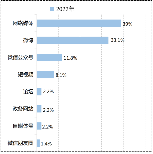 2022年,網絡媒體與微博仍為政法輿情最主要的“策源地”,自兩平臺發(fā)酵的輿情數(shù)量已超過七成,其中網絡媒體占比達39%,居于首位。一般情況下,網民發(fā)布爆料內容后引發(fā)關注,媒體進而追蹤報道,助推輿情走高。發(fā)酵于微信公眾號的輿情數(shù)量居第三位,相關輿情內容多為政法機關新媒體宣傳案例及自媒體爆料。例如山東高法官方微信文章稱不能僅以出軌為由請求離婚、廣州司法局官微虛構故事情節(jié)進行普法等事件均引發(fā)輿論熱議,相關微博話題閱讀量超數(shù)億人次,可見政法機關新媒體作為宣傳主陣地,其隱含的輿情價值與潛藏的輿情風險同樣不可忽視。來源于短視頻平臺的輿情占比8.1%,包括四川網紅博主食用瀕危大白鯊案、蘇州淮海路步行街女子因穿和服被警方帶走事件等。發(fā)酵自政務網站、論壇、自媒體號、微信朋友圈的輿情占比合計8%,其中來源于政務網站的輿情多為法院判決爭議案件。