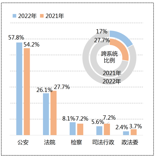從系統(tǒng)分布來看,公安系統(tǒng)輿情數(shù)量居首位,占比近六成,與2021年的數(shù)據相近。一方面,本年度特別重大、重大公共安全事故多發(fā),包括東航MU5735航空器飛行事故、湖南長沙自建房倒塌事故、河南安陽火災事故等;另一方面,刑事案件發(fā)生率較高,占公安系統(tǒng)輿情比重過半,包括江西安福幼兒園命案、安徽靈璧縣漁溝中學學生死亡案等。在個別性質惡劣的案件中,公安機關執(zhí)法水平、速度與方式遭受質疑。法院系統(tǒng)輿情占比26.1%,居于第二位,其中判罰爭議為最主要輿情類型。檢察院、司法行政、政法委等領域輿情均較低??缦到y(tǒng)輿情占比17%,較2021年下降幅度較大,關注度較高的案件有河北唐山“燒烤店打人案”、南京女大學生被害案、劉學州自殺案等,覆蓋公檢法等多個系統(tǒng)。