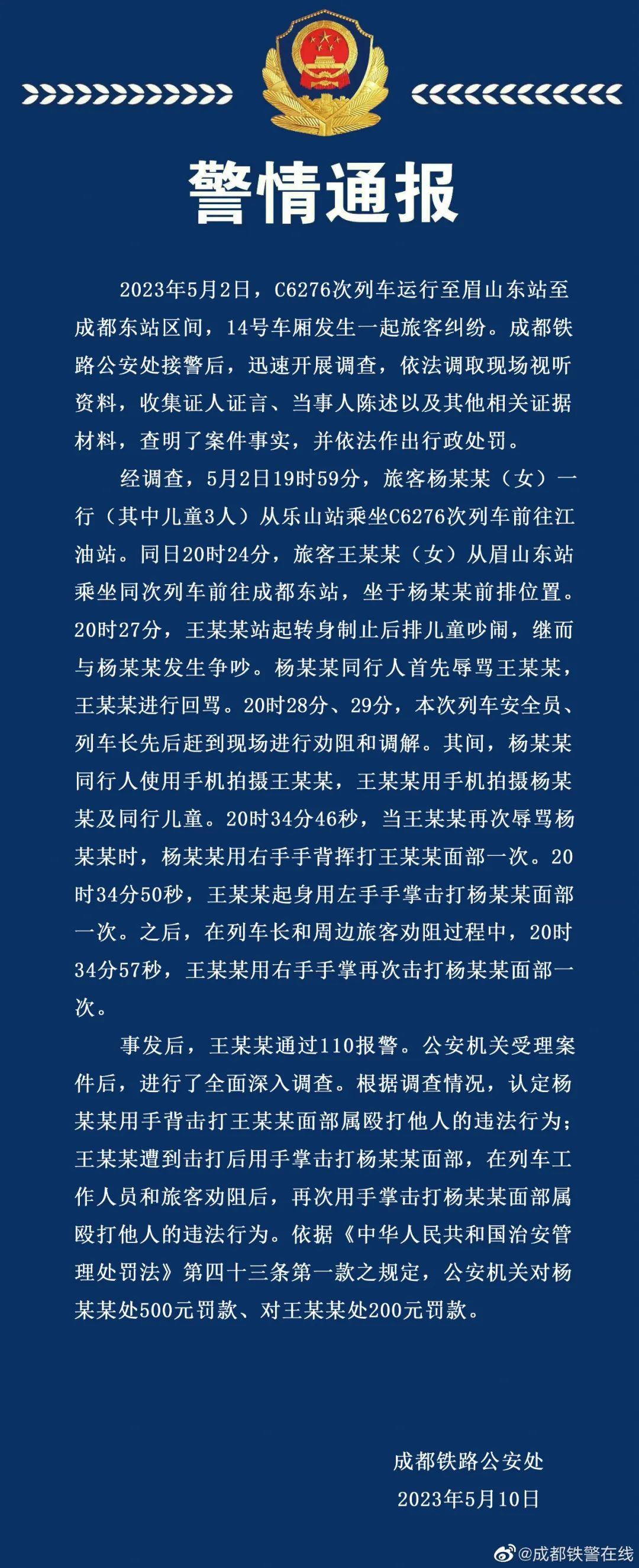 面對網(wǎng)絡(luò)質(zhì)疑,5月10日,成都鐵路公安處官方微博“@成都鐵警在線”發(fā)布警情通報稱,根據(jù)調(diào)查情況,認定楊某某用手背擊打王某某面部屬毆打他人的違法行為;王某某遭到擊打后用手掌擊打楊某某面部,在列車工作人員和旅客勸阻后,再次用手掌擊打楊某某面部屬毆打他人的違法行為。警方據(jù)此認為雙方均違反治安管理處罰法,并處以不同金額的罰款。隨后,四川廣播電視臺“@四川觀察”、封面新聞公布現(xiàn)場視頻,涉及列車車廂監(jiān)控、列車長巡檢記錄儀、當事雙方手機所拍視頻等多個角度,直觀地呈現(xiàn)雙方發(fā)生爭執(zhí)繼而爆發(fā)肢體沖突的過程。網(wǎng)絡(luò)討論熱度再次攀升,微博上形成“#高鐵掌摑事件雙方曾多次對罵#”“#高鐵被打女子2次打人被認定違法#”“#王某某被打后兩次掌摑楊某某#”等多個話題,不少網(wǎng)民一改之前支持王某某的立場。但部分網(wǎng)民仍從情感角度出發(fā),質(zhì)疑官方對視頻進行二次剪輯,認為警方苛求被打者還擊的間隔時間有失公平。