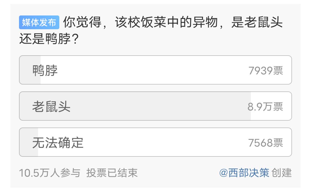 大量網(wǎng)民質(zhì)疑當(dāng)?shù)叵嚓P(guān)部門(mén)“指鼠為鴨”。據(jù)“@西部決策”發(fā)起的一項(xiàng)超10萬(wàn)人參與的微博投票顯示,近九成網(wǎng)民認(rèn)為食堂中的異物為“鼠頭”,不少科普博主、微博大V還有媒體均就此事發(fā)表評(píng)論,輿論場(chǎng)基調(diào)以追問(wèn)和批評(píng)為主。6月6日上午,微博話題“#長(zhǎng)牙的鴨脖令人如鯁在喉#”沖上熱搜榜第一位。另?yè)?jù)《河南商報(bào)》報(bào)道,有網(wǎng)民爆料該校一教職工疑似要求學(xué)生針對(duì)此事進(jìn)行“控評(píng)”。輿論場(chǎng)上,除了批評(píng)校方說(shuō)謊、隱瞞等聲音之外,還有網(wǎng)民疑惑市場(chǎng)監(jiān)管部門(mén)為何替學(xué)?!罢九_(tái)”,猜測(cè)背后存在利益輸送等問(wèn)題;也有網(wǎng)民拍攝視頻解釋稱,鴨脖在某個(gè)角度看起來(lái)很像老鼠頭;更多網(wǎng)民呼吁當(dāng)?shù)乇O(jiān)管部門(mén)拿出更多檢測(cè)證據(jù)來(lái)。