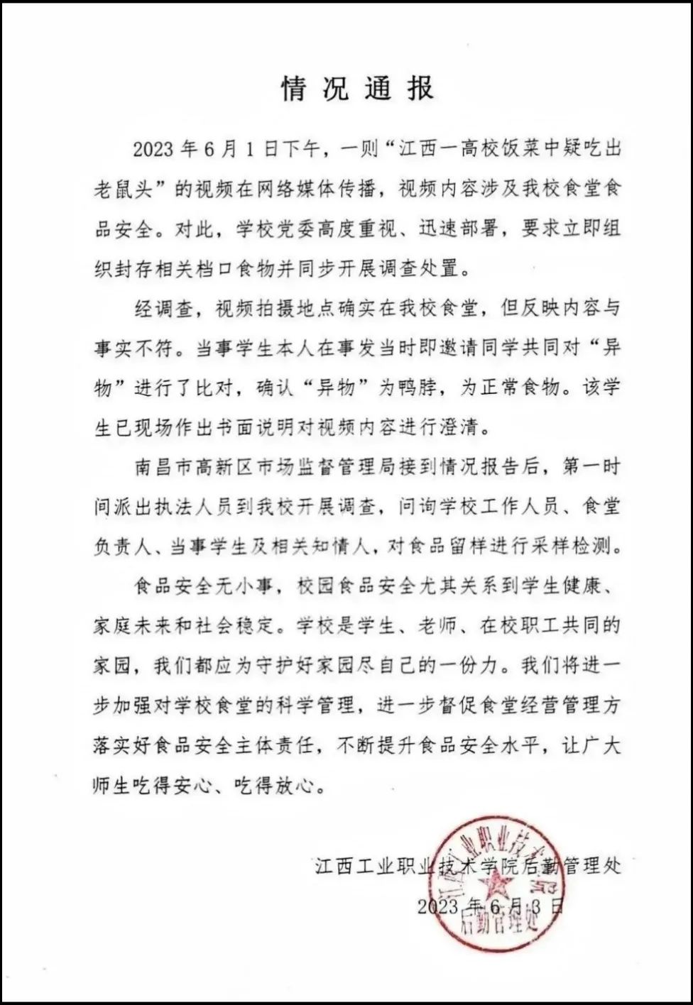 6月3日晚,江西工業(yè)職業(yè)技術(shù)學(xué)院通過(guò)官方微博通報(bào)稱,當(dāng)事學(xué)生在事發(fā)當(dāng)時(shí)即邀請(qǐng)同學(xué)比對(duì)“異物”,確認(rèn)為鴨脖,為正常食物。該學(xué)生已現(xiàn)場(chǎng)做出書(shū)面說(shuō)明對(duì)視頻內(nèi)容進(jìn)行澄清。同日晚,在江西廣播電視臺(tái)《都市現(xiàn)場(chǎng)》欄目發(fā)布的報(bào)道中,南昌市高新區(qū)市場(chǎng)監(jiān)督管理局昌東分局局長(zhǎng)江協(xié)學(xué)介紹稱,經(jīng)反復(fù)對(duì)比確認(rèn)異物就是鴨脖。對(duì)于校方解釋和市場(chǎng)監(jiān)管部門(mén)的回應(yīng),網(wǎng)民仍不買(mǎi)賬,評(píng)論稱視頻中老鼠的牙齒、胡須赫然可見(jiàn),追問(wèn)或調(diào)侃“鴨脖里怎么有牙齒”“老鼠身去哪兒了”,其中“指鼠為鴨”一詞引起廣泛傳播。