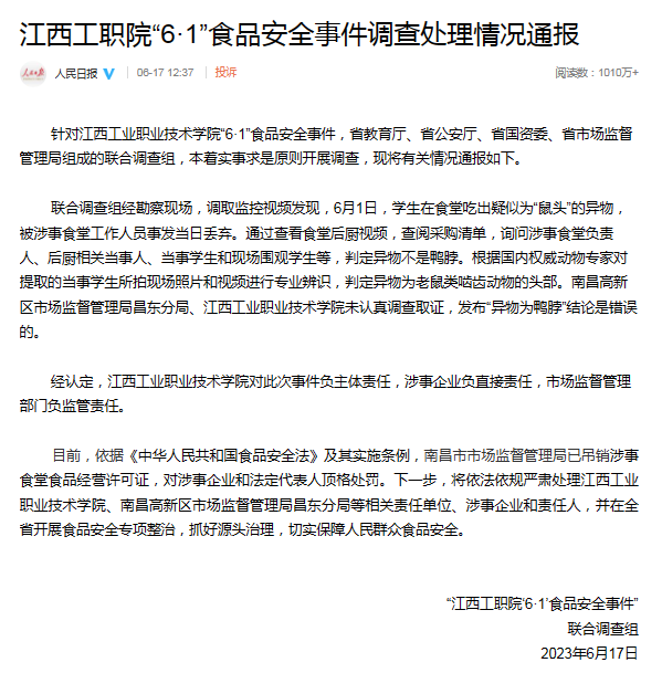 6月2日,據(jù)“@沸點(diǎn)視頻”稱,6月1日,網(wǎng)曝江西工業(yè)職業(yè)技術(shù)學(xué)院學(xué)生吃飯吃出來(lái)老鼠頭。據(jù)抖音短視頻顯示,一男子告知食堂工作人員吃出來(lái)老鼠頭,工作人員表示“是鴨肉”。報(bào)道稱,涉事的學(xué)校餐飲公司南昌市菁禾餐飲工作人員表示“已經(jīng)看到視頻了,會(huì)去調(diào)查核實(shí)處理”。隨后“@頭條新聞”等賬號(hào)轉(zhuǎn)載該新聞,部分網(wǎng)民留言評(píng)論表示“不信”,并調(diào)侃稱“說(shuō)是鴨肉的那個(gè)讓他吃掉”。