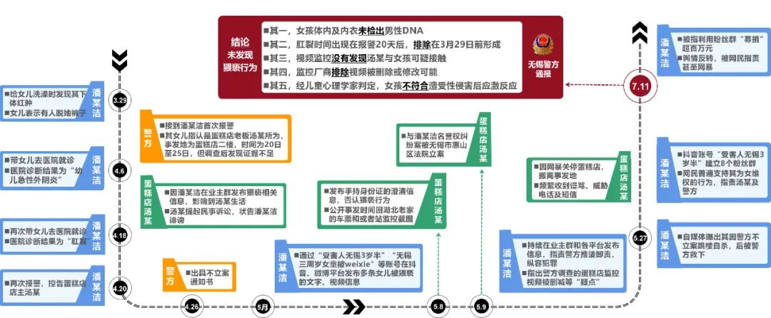 面對巨大的輿情壓力,7月11日,無錫市公安局發(fā)布通報,詳述調(diào)查過程,包括DNA檢測、肛裂原因排除、視頻監(jiān)控核查、心理學家判定等內(nèi)容。通報全文800余字,邏輯清晰、內(nèi)容詳實,“不存在猥褻行為”這一結(jié)論獲得輿論認可,“#警方通報無錫3歲女童事件調(diào)查結(jié)果#”等微博話題閱讀量累計近6億。至此,輿情反轉(zhuǎn),多數(shù)網(wǎng)民指責潘某潔虛構(gòu)事實、利用女兒造謠污蔑,呼吁依法對其嚴懲。