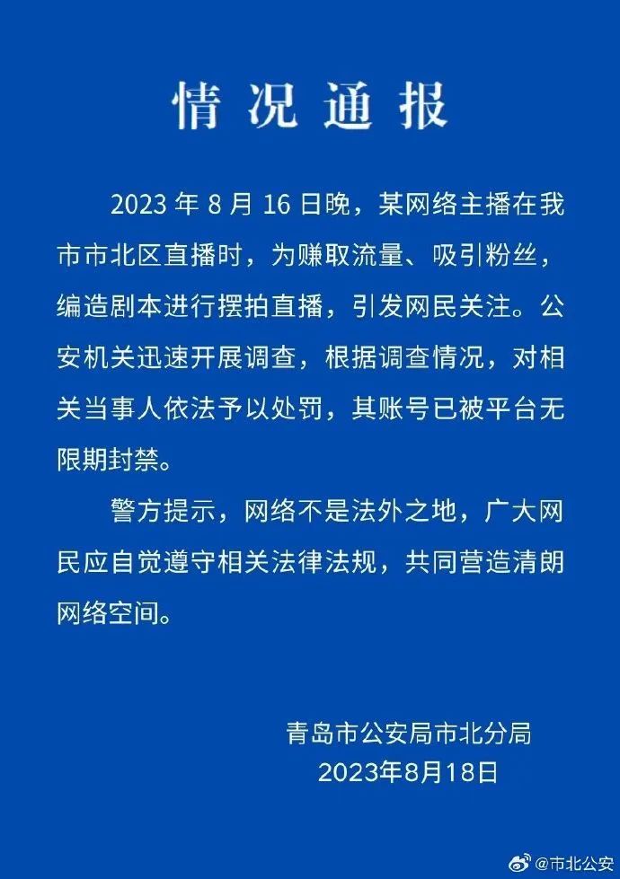 8月18日,青島市公安局市北分局微博賬號(hào)“@市北公安”通報(bào)稱,某網(wǎng)絡(luò)主播在青島市市北區(qū)直播時(shí),為賺取流量、吸引粉絲,編造劇本進(jìn)行擺拍直播。公安機(jī)關(guān)對(duì)相關(guān)當(dāng)事人依法予以處罰,其賬號(hào)已被平臺(tái)無(wú)限期封禁?!?二驢#”“#警方通報(bào)網(wǎng)傳二驢直播被綁架#”等多個(gè)話題閱讀量近6.7億。輿論對(duì)此結(jié)果表示認(rèn)同,評(píng)論稱“山東警方果斷調(diào)查處置,結(jié)果大快人心”。