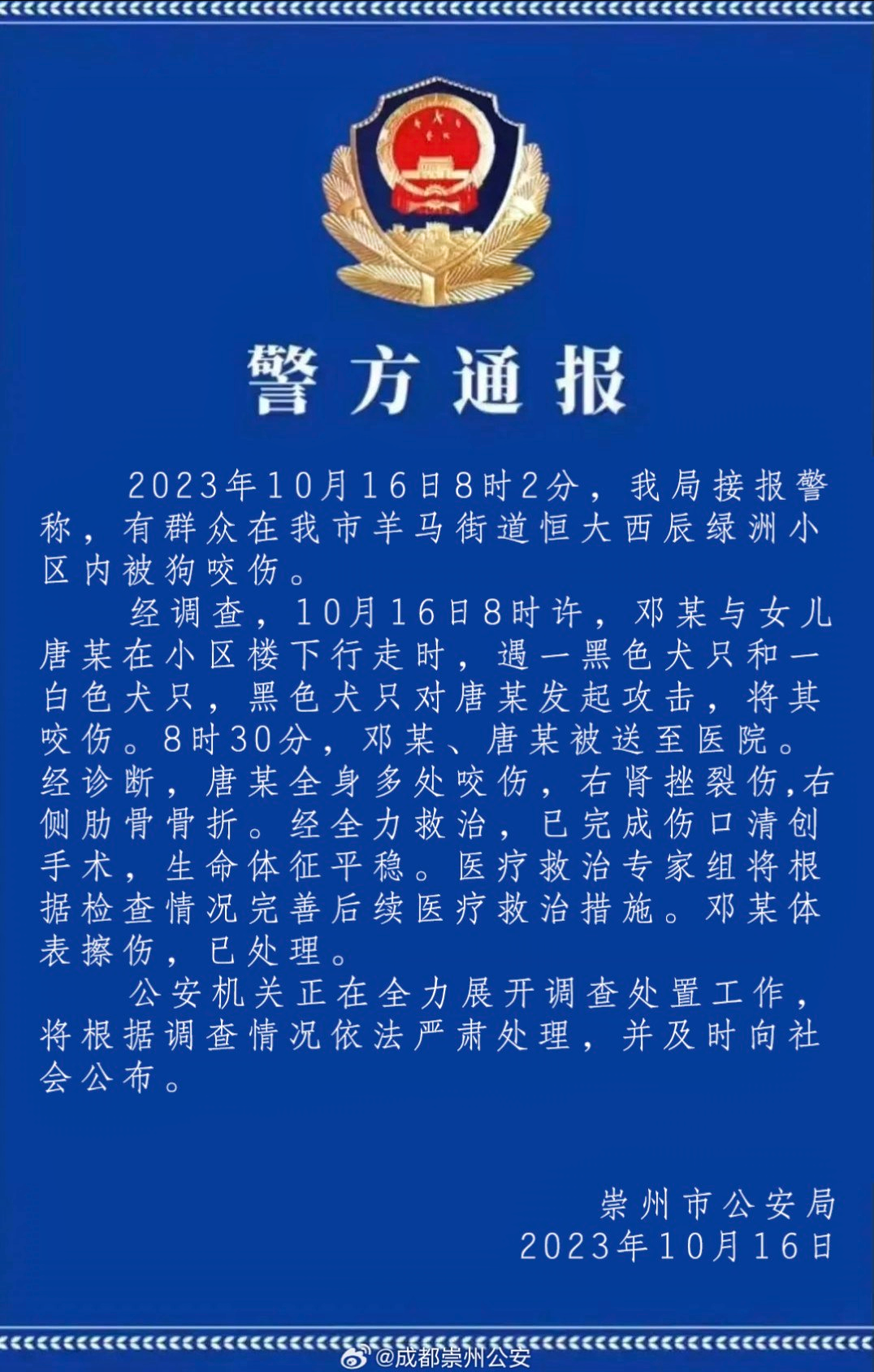 事發(fā)當(dāng)日17時(shí)許,崇州公安發(fā)布首份通報(bào),稱被咬女童生命體征平穩(wěn),正全力展開調(diào)查處置工作。輿論場(chǎng)中不少網(wǎng)民探究事發(fā)原因,認(rèn)為養(yǎng)犬規(guī)定落實(shí)不到位,導(dǎo)致遛狗不牽繩、飼養(yǎng)烈性犬等亂象出現(xiàn)。10月17日,據(jù)受傷女童母親透露,涉事黑犬已被找到,警方還在排查狗主人。另有媒體報(bào)道稱,成都禁養(yǎng)22種烈性犬不包括羅威納,部分網(wǎng)民對(duì)警方工作效率表達(dá)不滿情緒。