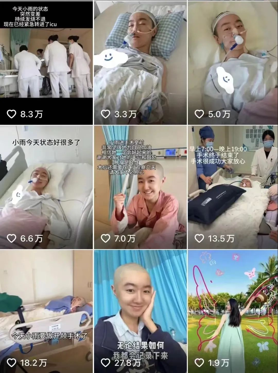 2月29日,曾走紅全國的“點讀機女孩”高君雨在社交平臺發(fā)視頻,自曝罹患罕見腦瘤,引發(fā)網民同情。此后數(shù)日,高君雨陸續(xù)在個人社交賬號更新了多段視頻,包括剃頭、做手術以及術后恢復等過程,持續(xù)受到網民關注。
