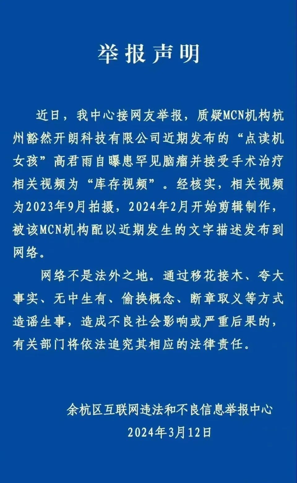 3月12日,涉事MCN機構杭州豁然開朗科技有限公司發(fā)布致歉聲明稱,文案的時間表述出現(xiàn)嚴重紕漏,從未進行過捐款、打賞等盈利性操作。網民對此說法并不認可,事件持續(xù)發(fā)酵。當日,杭州市余杭區(qū)互聯(lián)網違法和不良信息舉報中心通報稱,經核實,相關視頻為2023年9月拍攝,2024年2月開始剪輯制作,被MCN機構配以近期發(fā)生的文字描述發(fā)布到網絡,有關部門將依法追究其法律責任。另據(jù)潮新聞報道,涉事MCN機構負責人正在接受調查。
