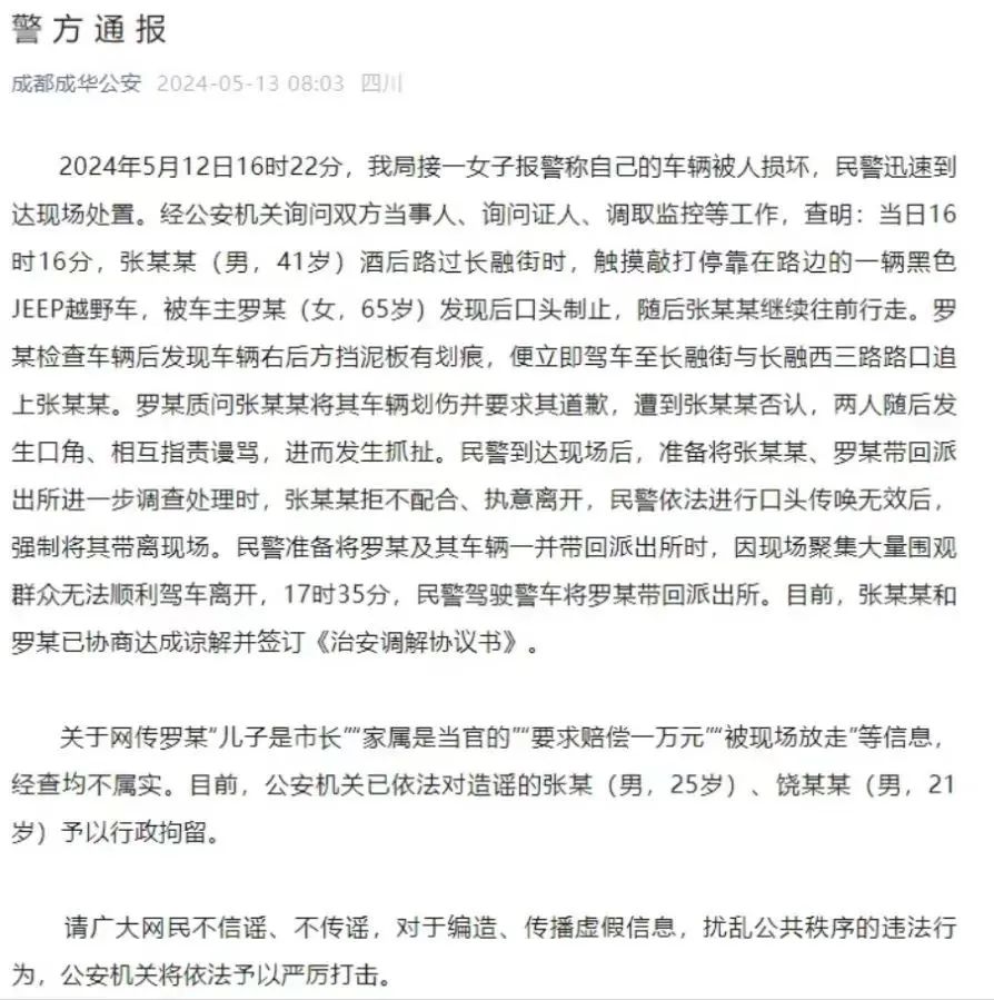 5月13日8時(shí)許,成都市成華區(qū)警方發(fā)布通報(bào)介紹事發(fā)過(guò)程,稱(chēng)5月12日16時(shí)許,張某某(男,41歲)酒后觸摸敲打??吭诼愤叺牧_某(女,65歲)的車(chē),雙方發(fā)生口角抓扯。張某某拒不配合、執(zhí)意離開(kāi),民警依法進(jìn)行口頭傳喚無(wú)效后,強(qiáng)制將其帶離現(xiàn)場(chǎng)。民警準(zhǔn)備將羅某及其車(chē)輛一并帶回派出所時(shí),因現(xiàn)場(chǎng)聚集大量圍觀群眾無(wú)法順利駕車(chē)離開(kāi)。目前,雙方已協(xié)商達(dá)成諒解并簽訂調(diào)解書(shū),網(wǎng)傳羅某“要求賠償一萬(wàn)元”“被現(xiàn)場(chǎng)放走”等信息均不屬實(shí),公安機(jī)關(guān)已依法對(duì)造謠的張某和饒某某予以行政拘留。該通報(bào)被光明網(wǎng)、“@四川日?qǐng)?bào)”等媒體轉(zhuǎn)發(fā)后帶動(dòng)輿情升溫,“#警方通報(bào)男子摸車(chē)被索賠1萬(wàn)#”等熱搜話題閱讀量累積近8000萬(wàn)次。部分網(wǎng)民調(diào)侃車(chē)主“神通廣大”,吐槽“以后停在路邊的車(chē)別亂摸”;有網(wǎng)民對(duì)通報(bào)內(nèi)容表示懷疑,追問(wèn)為何“把吉普車(chē)圍起來(lái)”等,還有網(wǎng)民呼吁公開(kāi)現(xiàn)場(chǎng)監(jiān)控?!癅作家劉小?!薄癅無(wú)心簡(jiǎn)影”等大V則力挺成都警方,反問(wèn)“成都市長(zhǎng)快60的人了,怎么可能有個(gè)65歲的媽”“難道不是因?yàn)楝F(xiàn)場(chǎng)有人煽動(dòng)造成人員聚集,怕現(xiàn)場(chǎng)失控才來(lái)了這么多警察嗎”。